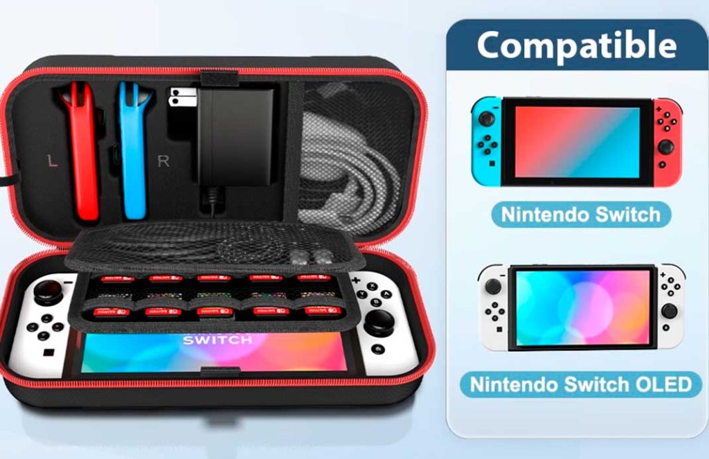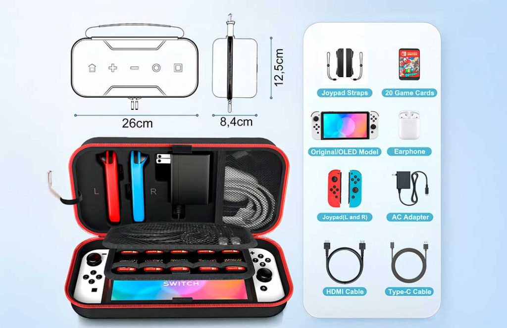 Compartimentos diseñados para guardar joysticks, juegos, cargador y accesorios sin apretarlos ni dañarlos.