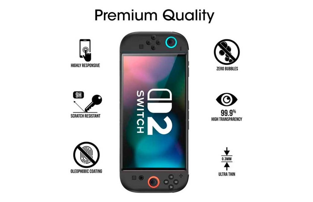 Incluye 1 Protector de pantalla de vidrio templado resistente a rayones y huellas 6 grips de silicona para joysticks, que mejoran el agarre y la precisión